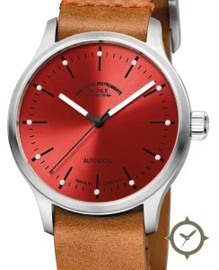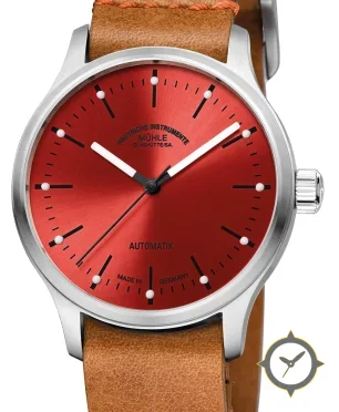 A Minimalist watch with a bold 43.5mm presence on the wrist, crafted from stainless steel featuring a red dial with a unique sunburst finish.