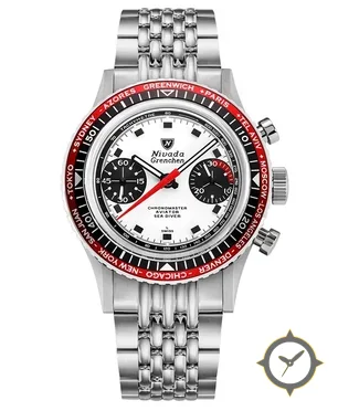 A Chronograph watch with a vintage-inspired 32.5mm case, crafted from stainless steel featuring a white dial with a unique matte lacquer finish, perfect for the global traveler with its world-time function.