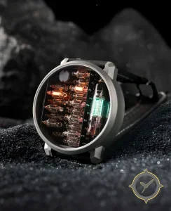 A Digital watch with a bold 49mm presence on the wrist, crafted from stainless steel featuring a black dial with a unique exposed electronic components / Nixie/VFD-style tubes finish.
