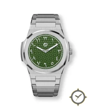 A Luxury watch with a versatile 39.5mm case, that suits most wrists, crafted from stainless steel featuring a green dial with a unique interlaced geometric guilloché / woven texture finish and a true GMT complication for tracking a second time zone.