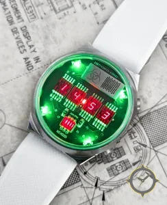 A Digital watch with a vintage-inspired 34mm case, crafted from stainless steel featuring a green dial with a unique exposed printed circuit board with LED modules finish.
