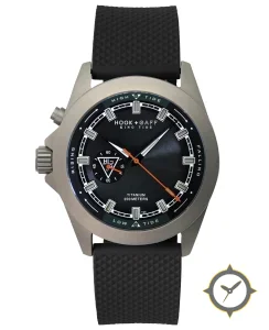 A Nautical watch with a bold 41.5mm presence on the wrist, crafted from titanium featuring a black dial with a unique concentric circular guilloche / radial grooves finish.