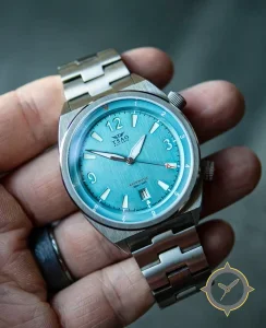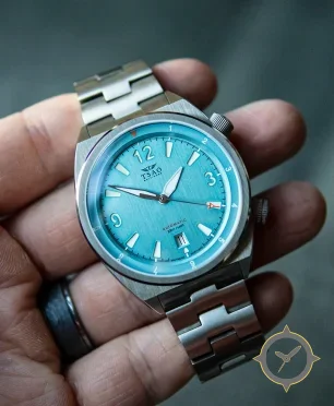 A Dive watch with a bold 43mm presence on the wrist, crafted from stainless steel featuring a turquoise dial with a unique brushed finish.
