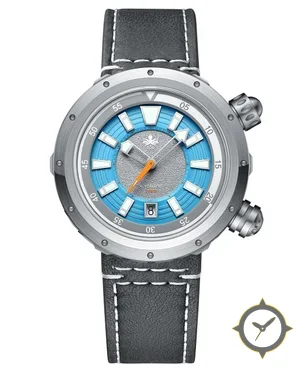 A Dive watch with a bold 48mm presence on the wrist, crafted from stainless steel featuring a blue dial with a unique textured/grained central area with concentric circular grooves finish.