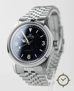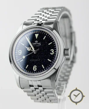 A Field watch with a vintage-inspired 31mm case, crafted from stainless steel featuring a navy dial with a unique aventurine / sparkled (speckled) finish finish.