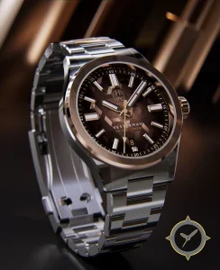 A Sports watch with a bold 42.5mm presence on the wrist, crafted from stainless steel featuring a brown dial with a unique metallic sunburst with 3D embossed geometric (hexagonal) texture finish.