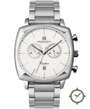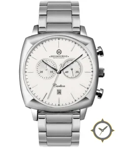 A Chronograph watch with a vintage-inspired 36.5mm case, crafted from stainless steel featuring a white dial with a unique textured matte (slightly grained) finish.