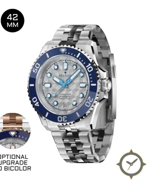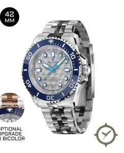 A Dive watch with a bold 49mm presence on the wrist, crafted from stainless steel featuring a silver dial with a unique hexagonal guilloché / tessellated geometric texture finish.