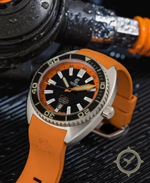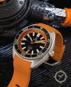 A Dive watch with a bold 44.5mm presence on the wrist, crafted from stainless steel featuring a black dial with a unique matte with contrasting orange chapter ring finish.