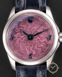 A Dress watch with a vintage-inspired 30.5mm case, crafted from stainless steel featuring a purple dial with a unique guilloché (engine-turned) spiral / flinqué finish.