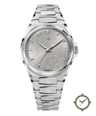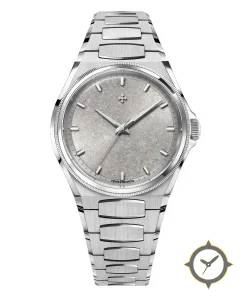 A Luxury watch with a vintage-inspired 36.5mm case, crafted from stainless steel featuring a silver dial with a unique frosted/stone-like granular texture finish.