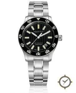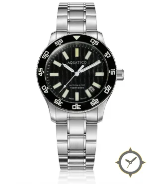 A Dive watch with a vintage-inspired 36.5mm case, crafted from stainless steel featuring a black dial with a unique wave finish.