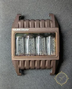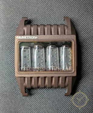 A Digital watch with a bold 56mm presence on the wrist, crafted from resin featuring a black dial with a unique visible vacuum fluorescent tube modules behind a clear crystal (glossy glass) finish.