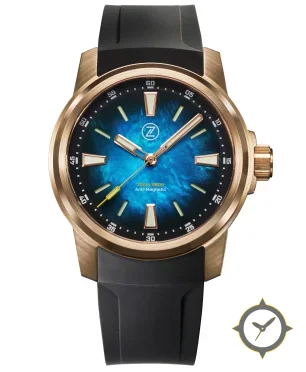A Dive watch with a vintage-inspired 33.5mm case, crafted from bronze featuring a blue dial with a unique iridescent marbled finish.
