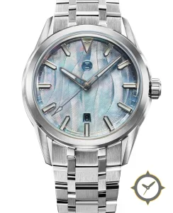 A Sports watch with a bold 42mm presence on the wrist, crafted from stainless steel featuring a turquoise dial with a unique mother-of-pearl iridescent with fine wave guilloché texture finish.
