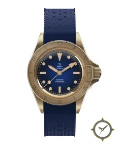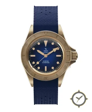 A Dive watch with a vintage-inspired 34mm case, crafted from bronze featuring a blue dial with a unique sunburst (fumé gradient) finish.