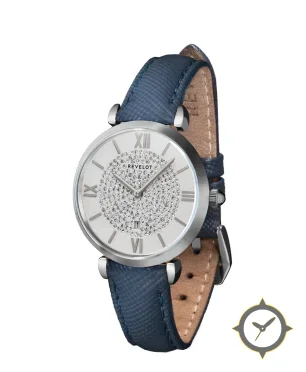 A Dress watch with a vintage-inspired 36.5mm case, crafted from stainless steel featuring a silver dial with a unique pavé crystal (crystal-studded) finish.