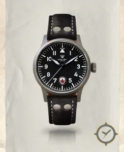 A Pilot watch with a bold 43mm presence on the wrist, crafted from stainless steel featuring a black dial with a unique matte finish.