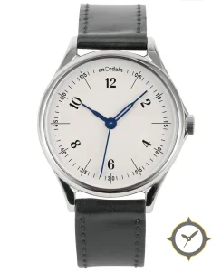 A Minimalist watch with a vintage-inspired 34mm case, crafted from stainless steel featuring a white dial with a unique smooth finish.