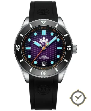A Dive watch with a bold 46mm presence on the wrist, crafted from stainless steel featuring a purple dial with a unique wavy finish.