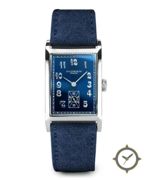 A Dress watch with a vintage-inspired 20.5mm case, crafted from stainless steel featuring a blue dial with a unique sunburst metallic finish finish.