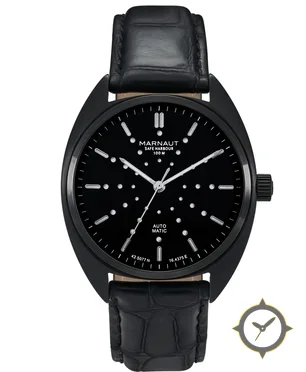 A Minimalist watch with a vintage-inspired 34.5mm case, crafted from Coating featuring a black dial with a unique glossy lacquer finish.