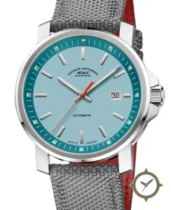 A Sports watch with a bold 50mm presence on the wrist, crafted from stainless steel featuring a turquoise dial with a unique matte finish.
