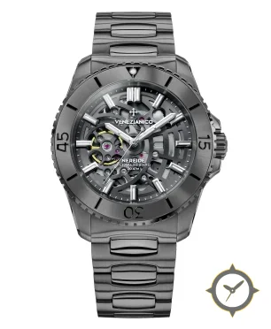 A Dive watch with a bold 42.5mm presence on the wrist, crafted from stainless steel featuring a gray dial with a unique skeletonized / open-work finish.