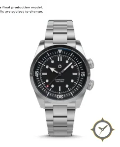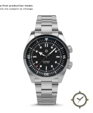 A Dive watch with a bold 42.5mm presence on the wrist, crafted from stainless steel featuring a black dial with a unique matte finish.