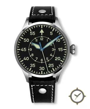 A Pilot watch with a bold 41.5mm presence on the wrist, crafted from stainless steel featuring a black dial with a unique matte finish.