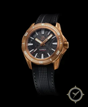 A Dive watch with a bold 43.5mm presence on the wrist, crafted from bronze featuring a black dial with a unique meteorite-style textured finish with irregular striations finish.