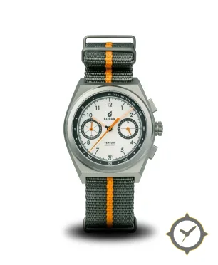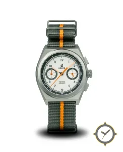 A Chronograph watch with a vintage-inspired 35mm case, crafted from titanium featuring a white dial with a unique matte finish.