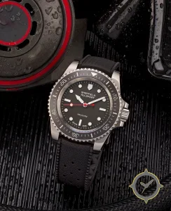 A Dive watch with a vintage-inspired 36.5mm case, crafted from stainless steel featuring a black dial with a unique matte finish.
