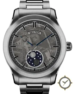 A Luxury watch with a versatile 38mm case, that suits most wrists, crafted from stainless steel featuring a gray dial with a unique meteorite (Widmanstätten) finish finish and a beautiful moonphase display.