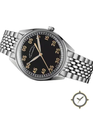 A Pilot watch with a bold 44mm presence on the wrist, crafted from stainless steel featuring a black dial with a unique matte finish.