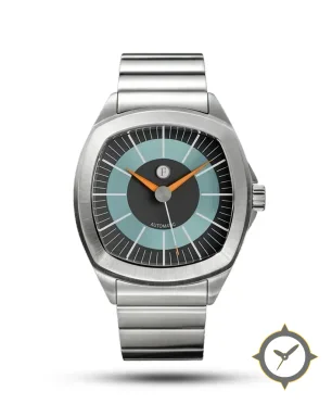 A Sports watch with a vintage-inspired 35.5mm case, crafted from stainless steel featuring a turquoise dial with a unique concentric sunburst brushing on the turquoise ring with matte central disc finish.