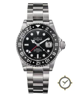 A watch with a vintage-inspired 37mm case, crafted from stainless steel featuring a black dial with a unique glossy finish.