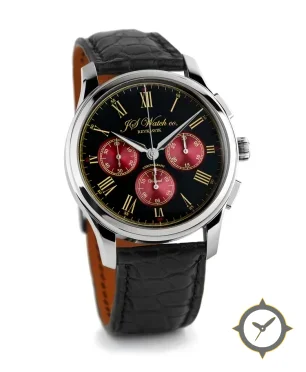 A Chronograph watch with a bold 42mm presence on the wrist, crafted from stainless steel featuring a black dial with a unique glossy lacquer finish.