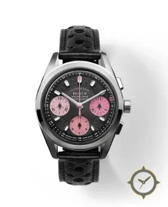 A Racing watch with a vintage-inspired 36.5mm case, crafted from stainless steel featuring a black dial with a unique textured/grained finish.