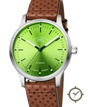 A Minimalist watch with a bold 44.5mm presence on the wrist, crafted from stainless steel featuring a green dial with a unique sunburst (radial brushing) finish.