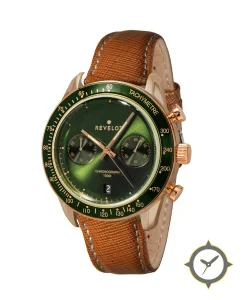 A Chronograph watch with a bold 44mm presence on the wrist, crafted from gold featuring a green dial with a unique sunburst metallic finish.
