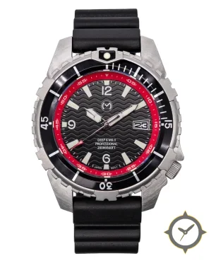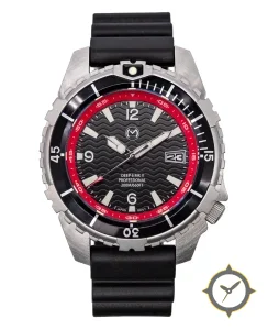 A Dive watch with a bold 55.5mm presence on the wrist, crafted from stainless steel featuring a black dial with a unique embossed wavy texture (wave pattern) finish and a true GMT complication for tracking a second time zone.