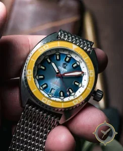 A Dive watch with a bold 44mm presence on the wrist, crafted from stainless steel featuring a blue dial with a unique sunburst finish.