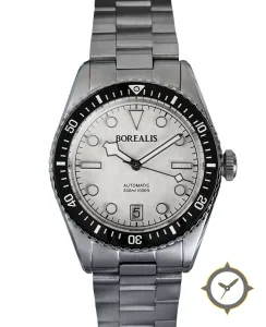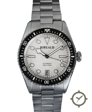 A Dive watch with a vintage-inspired 35mm case, crafted from stainless steel featuring a white dial with a unique mother-of-pearl / marbled finish.