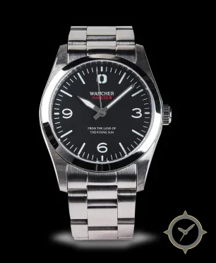 A Field watch with a vintage-inspired 31.5mm case, crafted from stainless steel featuring a black dial with a unique matte finish.