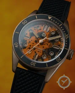 A Dive watch with a vintage-inspired 31.5mm case, crafted from bronze featuring a orange dial with a unique marbled / patina (spattered) finish.