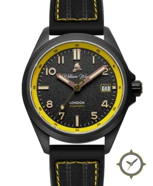 A Sports watch with a vintage-inspired 34.5mm case, crafted from Coating featuring a black dial with a unique grained/textured finish.