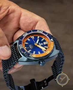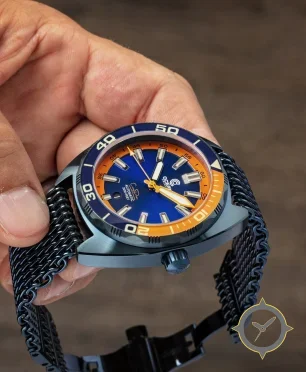 A Dive watch with a bold 42.5mm presence on the wrist, crafted from stainless steel featuring a blue dial with a unique sunburst with contrasting orange inner chapter ring finish.