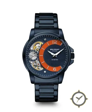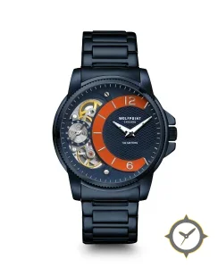 A Skeleton watch with a bold 43mm presence on the wrist, crafted from stainless steel featuring a blue dial with a unique wavy guilloché texture finish.