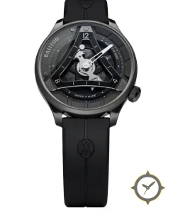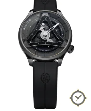 A Skeleton watch with a bold 43mm presence on the wrist, crafted from stainless steel featuring a black dial with a unique skeletonized / open-work with multi-layer bridges finish.